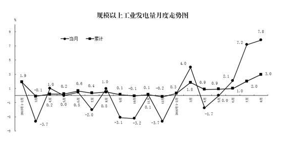8月份,規(guī)模以上工業(yè)發(fā)電量同比增長(zhǎng)7.8%,增速比7月份加快0.6個(gè)百分點(diǎn);1-8月份,規(guī)模以上工業(yè)發(fā)電量同比增長(zhǎng)3.0%,增速比1-7月份加快1.0個(gè)百分點(diǎn)。