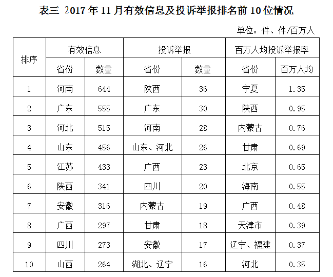 2017年11月,各?。ㄗ灾螀^(qū)、直轄市)按照有效信息數(shù)量排序,河南、廣東、河北等省列全國(guó)前10位;按照投訴舉報(bào)數(shù)量排序,陜西、廣東、河南等省排在全國(guó)前10位;按照百萬(wàn)人均投訴舉報(bào)率排序,寧夏,陜西,內(nèi)蒙古等省位于全國(guó)前10位。(2017年11月有效信息及投訴舉報(bào)排名前10位情況見(jiàn)表三)