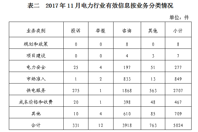 2017年11月收到的有效信息中,電力行業(yè)類5024件,占69.74%;新能源和可再生能源行業(yè)類1270件,占17.63%;石油天然氣行業(yè)類134件,占1.86%;煤炭行業(yè)類2件,占0.03%;其他事項(xiàng)774件,占10.74%。