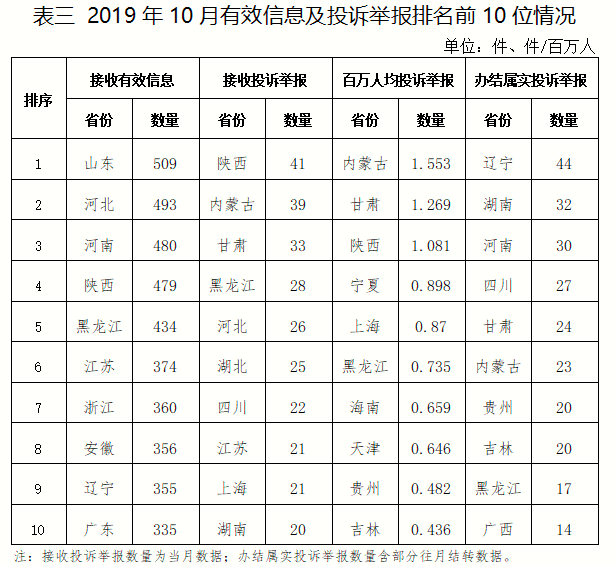 各?。ㄗ灾螀^(qū)、直轄市)按照收到的有效信息數(shù)量排序,山東、河北、河南、陜西、黑龍江等列全國前10位;按照投訴舉報(bào)數(shù)量排序,陜西、內(nèi)蒙古、甘肅、黑龍江、河北等排在全國前10位;按照百萬人均投訴舉報(bào)數(shù)量排序,內(nèi)蒙古、甘肅、陜西、寧夏、上海等排在全國前10位;按照辦結(jié)屬實(shí)投訴舉報(bào)數(shù)量排序,遼寧、湖南、河南、四川、甘肅等排在全國前10位。(2019年10月有效信息及投訴舉報(bào)排名前10位情況見表三)