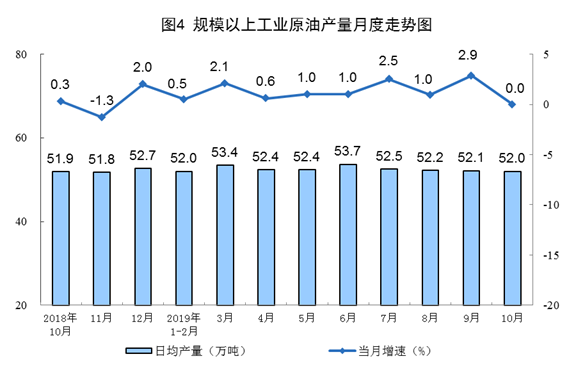 10月份,原油生產(chǎn)1611萬噸,產(chǎn)量與去年同期基本持平;日均產(chǎn)量52.0萬噸,環(huán)比減少0.1萬噸。1—10月份,原油生產(chǎn)15925萬噸,同比增長1.1%。