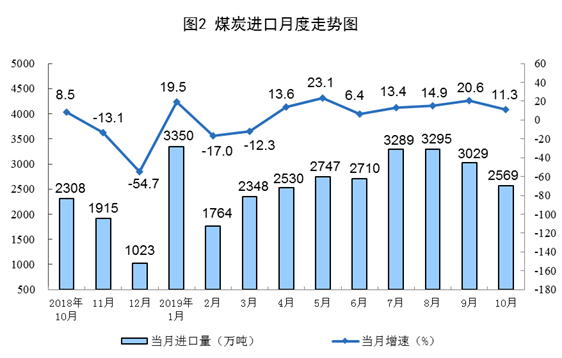 10月份,煤炭進(jìn)口2568.5萬噸,同比增長11.3%,增速比上月回落9.3個百分點;1—10月份,煤炭進(jìn)口2.8億噸,同比增長9.6%。