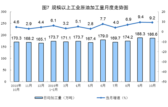 10月份,加工原油5784萬噸,同比增長9.2%,增速比上月放緩0.2個百分點;日均加工186.6萬噸,環(huán)比減少1.7萬噸。1—10月份,加工原油53710萬噸,同比增長6.4%。
