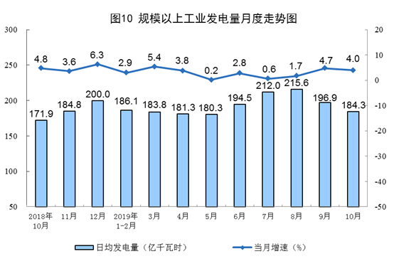 10月份,發(fā)電5714億千瓦時,同比增長4.0%,增速比上月放緩0.7個百分點;日均發(fā)電184.3億千瓦時,環(huán)比減少12.6億千瓦時。1—10月份,發(fā)電5.9萬億千瓦時,同比增長3.1%。
