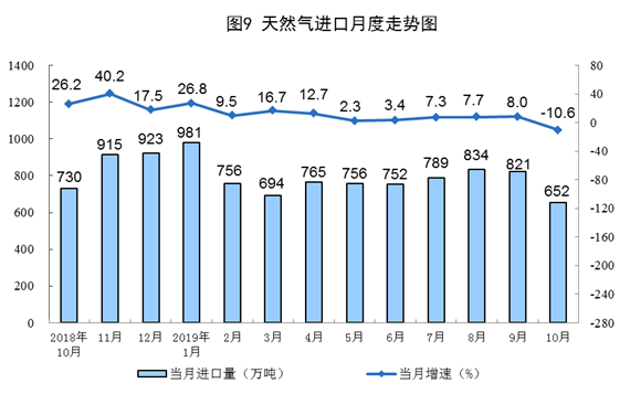 10月份,天然氣進(jìn)口652萬噸,同比下降10.6%,增速由正轉(zhuǎn)負(fù),上月為增長8.0%。1—10月份,天然氣進(jìn)口7771萬噸,同比增長7.9%。