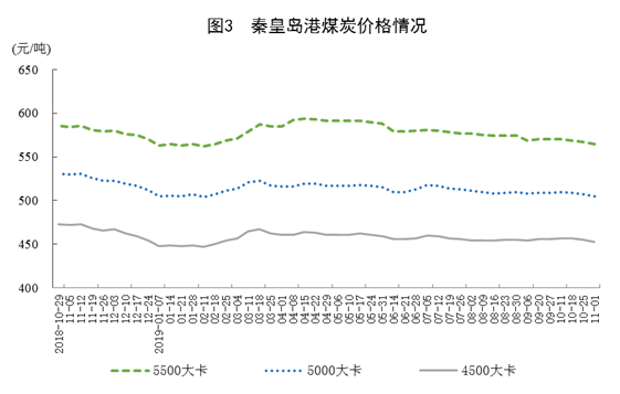 煤炭價格小幅下跌。11月1日,秦皇島港5500大卡、5000大卡和4500大卡煤炭綜合交易價格分別為每噸565元、505元和453元,比9月底分別回落5元、4元和3元。