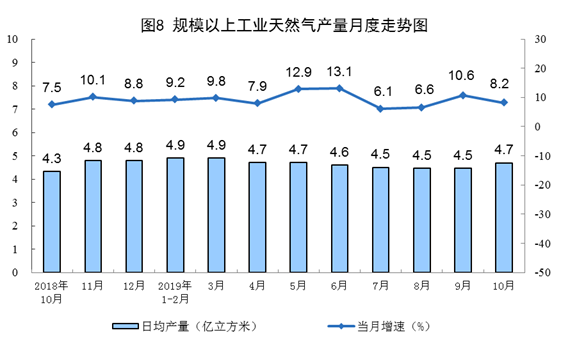 10月份,天然氣生產(chǎn)146億立方米,同比增長8.2%,增速比上月放緩2.4個百分點;日均產(chǎn)量4.7億立方米,環(huán)比增加0.2億立方米。1—10月份,天然氣生產(chǎn)1423億立方米,同比增長9.3%。