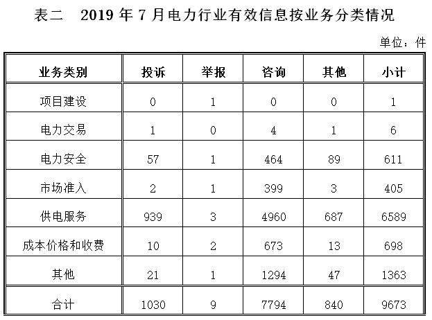 電力行業(yè)排在首位,有效信息數(shù)量為9673件,占全部有效信息的82.92%;其中受理的投訴舉報(bào)數(shù)量為1039件,占全部投訴舉報(bào)數(shù)量的96.38%。群眾反映的問(wèn)題主要集中在供電服務(wù)、電力安全、成本價(jià)格和收費(fèi)等方面。(2019年7月電力行業(yè)有效信息按業(yè)務(wù)分類情況見表二)