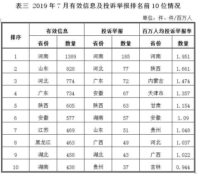 各?。ㄗ灾螀^(qū)、直轄市)按照收到的有效信息數(shù)量排序,河南、山東、河北、廣東、陜西等排在全國(guó)前10位;按照投訴舉報(bào)數(shù)量排序,河南、河北、廣東、安徽、陜西等排在全國(guó)前10位;按照百萬(wàn)人均投訴舉報(bào)數(shù)量排序,河南、陜西、內(nèi)蒙古、天津、甘肅等排在全國(guó)前10位。(2019年7月有效信息及投訴舉報(bào)排名前10位情況見表三)