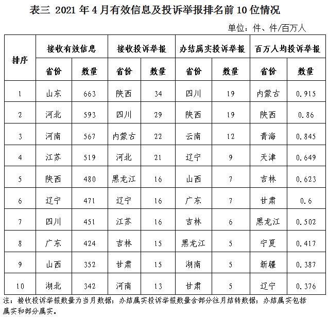 各省(自治區(qū)、直轄市)按照收到的有效信息數(shù)量排序,山東、河北、河南、江蘇、陜西、遼寧、四川、廣東、山西、湖北等列全國前10位;按照投訴舉報數(shù)量排序,陜西、四川、內(nèi)蒙古、河北、黑龍江、遼寧、江蘇、吉林、甘肅、河南等排在全國前10位;按照辦結屬實投訴舉報數(shù)量排序,四川、陜西、云南、遼寧、山西、廣東、吉林、黑龍江、湖南、甘肅等排在全國前10位;按照百萬人均投訴舉報數(shù)量排序,內(nèi)蒙古、陜西、青海、天津、吉林、甘肅、黑龍江、寧夏、新疆、遼寧等排在全國前10位。(2021年4月有效信息及投訴舉報排名前10位情況見表三)
