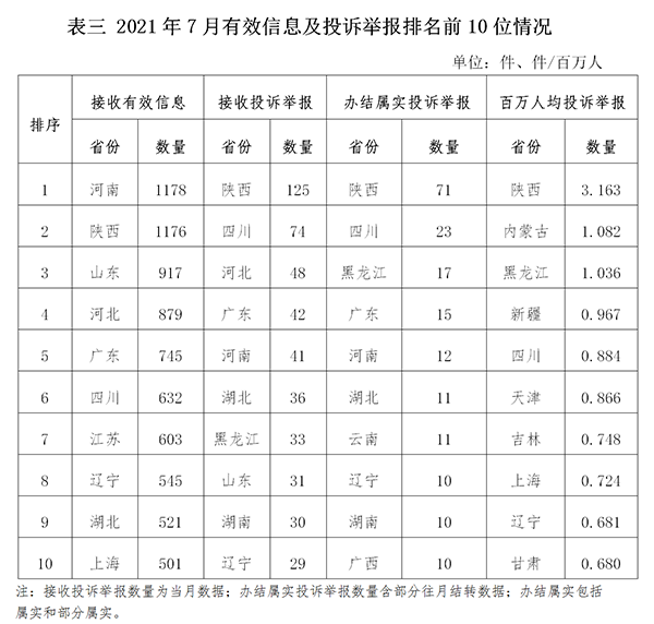 各省(自治區(qū)、直轄市)按照接收的有效信息數(shù)量排序,河南、陜西、山東、河北、廣東、四川、江蘇、遼寧、湖北、上海列全國前10位;按照接收的投訴舉報數(shù)量排序,陜西、四川、河北、廣東、河南、湖北、黑龍江、山東、湖南、遼寧排在全國前10位;按照辦結(jié)屬實的投訴舉報數(shù)量排序,陜西、四川、黑龍江、廣東、河南、湖北、云南、遼寧、湖南、廣西排在全國前10位;按照百萬人均投訴舉報數(shù)量排序,陜西、內(nèi)蒙古、黑龍江、新疆、四川、天津、吉林、上海、遼寧、甘肅排在全國前10位。(2021年7月有效信息及投訴舉報排名前10位情況見表三)