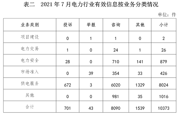 電力行業(yè)排在首位,有效信息數(shù)量為10373件,占全部有效信息的80.90%。群眾關(guān)注的內(nèi)容主要集中在故障停電、供電安全、電表計量咨詢等方面。(2021年7月電力行業(yè)有效信息按業(yè)務(wù)分類情況見表二)