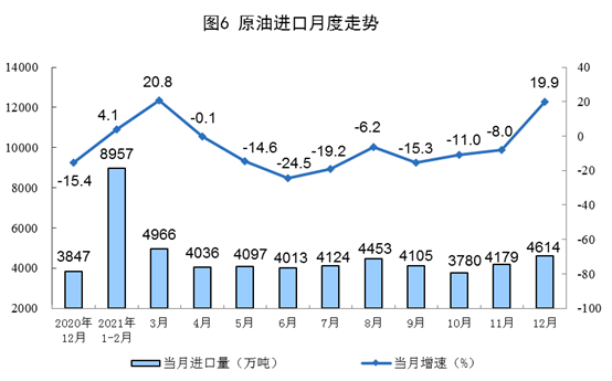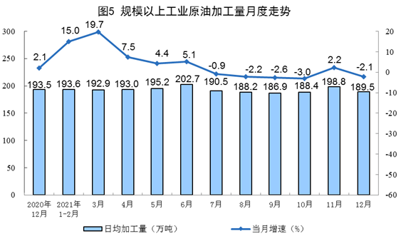 原油生產(chǎn)增速略有回落,加工量由增轉(zhuǎn)降。12月份,生產(chǎn)原油1647萬噸,同比增長1.7%,增速比上月放緩1.0個百分點,比2019年同期增長2.6%,兩年平均增長1.3%,日均產(chǎn)量53.1萬噸;加工原油5873萬噸,同比下降2.1%,上月為增長2.2%,比2019年同期下降0.1%,兩年平均下降0.1%,日均加工189.5萬噸。