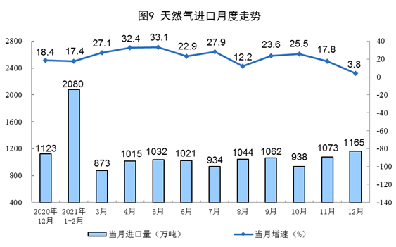 天然氣進口增速回落。12月份,進口天然氣1165萬噸,同比增長3.8%,增速比上月回落14.0個百分點。2021年,進口天然氣12136萬噸,比上年增長19.9%。