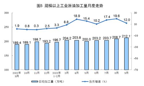 原油加工保持較快增長。9月份,加工原油6362萬噸,同比增長12.0%,增速比8月份回落7.6個百分點,日均加工原油212.1萬噸。1—9月份,加工原油55484萬噸,同比增長11.5%。