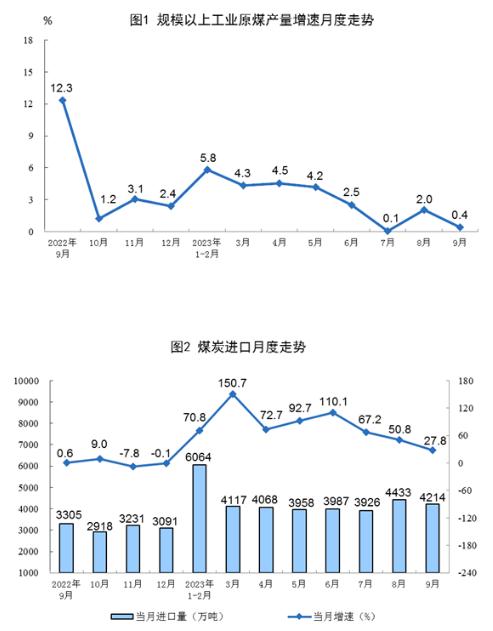 原煤生產保持穩(wěn)定,進口快速增長。9月份,生產原煤3.9億噸,同比增長0.4%,增速比8月份放緩1.6個百分點,日均產量1310萬噸。進口煤炭4214萬噸,同比增長27.8%,增速比8月份回落23.0個百分點。