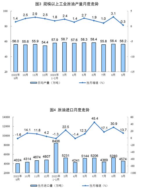 原油生產平穩(wěn)增長,進口較快增長。9月份,生產原油1687萬噸,同比增長0.3%,增速比8月份放緩2.8個百分點,日均產量56.2萬噸。進口原油4574萬噸,同比增長13.7%,增速比8月份回落17.2個百分點。