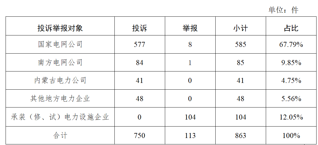 供電企業(yè)759件、占投訴舉報(bào)總數(shù)的87.95%,其中國(guó)家電網(wǎng)公司585件、占投訴舉報(bào)總數(shù)的67.79%,南方電網(wǎng)公司85件、占投訴舉報(bào)總數(shù)的9.85%,內(nèi)蒙古電力公司41件、占投訴舉報(bào)總數(shù)的4.75%,其他地方電力企業(yè)48件、占投訴舉報(bào)總數(shù)的5.56%;承裝(修、試)電力設(shè)施企業(yè)104件、占投訴舉報(bào)總數(shù)的12.05%。