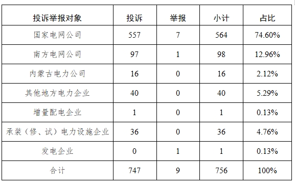 從被投訴舉報對象看,供電企業(yè)719件、占投訴舉報總數(shù)的95.11%,其中國家電網(wǎng)公司564件、占比74.60%,南方電網(wǎng)公司98件、占比12.96%,內(nèi)蒙古電力公司16件、占比2.12%,其他地方電力企業(yè)40件、占比5.29%,增量配電企業(yè)1件、占比0.13%;承裝(修、試)電力設施企業(yè)36件、占比4.77%;發(fā)電企業(yè)1件、占比0.13%。