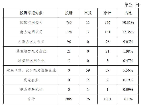 供電企業(yè)999件、占投訴舉報總數(shù)的94.16%,其中國家電網(wǎng)公司746件、占投訴舉報總數(shù)的70.31%,南方電網(wǎng)公司131件、占投訴舉報總數(shù)的12.35%,內(nèi)蒙古電力公司96件、占投訴舉報總數(shù)的9.05%,其他地方電力企業(yè)21件、占投訴舉報總數(shù)的1.98%,增量配電網(wǎng)企業(yè)5件、占投訴舉報總數(shù)的0.47%;承裝(修、試)電力設施企業(yè)59件、占投訴舉報總數(shù)的5.56%;發(fā)電企業(yè)2件,占投訴舉報總數(shù)的0.19%;電力交易機構1件、占投訴舉報總數(shù)的0.09%。
