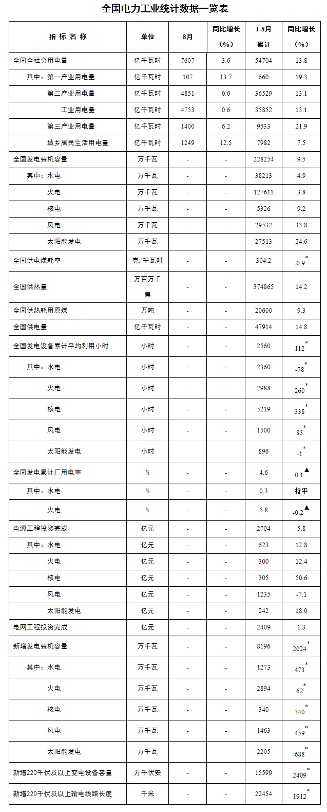 注:1.全社會用電量為全口徑數(shù)據(jù),全國供電量為調(diào)度口徑數(shù)據(jù)。2.“同比增長”列中,標*的指標為絕對量;標▲的指標為百分點。