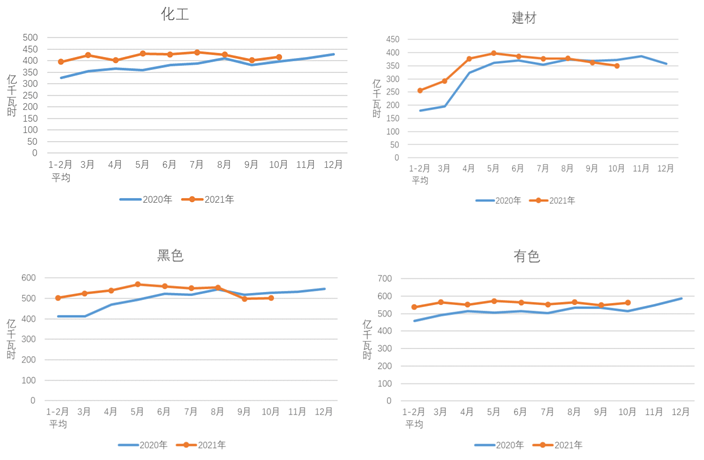 1-10月,化工行業(yè)用電量4156億千瓦時(shí),同比增長(zhǎng)8.1%,增速比上年同期提高7.7個(gè)百分點(diǎn);建材行業(yè)用電量3434億千瓦時(shí),同比增長(zhǎng)10.0%,增速比上年同期提高7.5個(gè)百分點(diǎn);黑色金屬冶煉行業(yè)用電量5302億千瓦時(shí),同比增長(zhǎng)8.8%,增速比上年同期提高5.6個(gè)百分點(diǎn);有色金屬冶煉行業(yè)用電量5558億千瓦時(shí),同比增長(zhǎng)7.2%,增速比上年同期提高3.6個(gè)百分點(diǎn)。