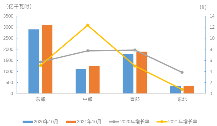 10月份,東、中、西部和東北地區(qū)全社會(huì)用電量增速分別為5.1%、12.3%、5.0%和0.8%。