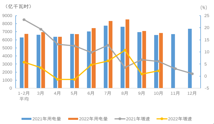 圖1 2021、2022年分月全社會(huì)用電量及其增速
