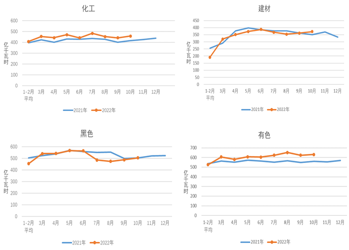 1-10月,化工行業(yè)用電量4523億千瓦時(shí),同比增長(zhǎng)5.3%;建材行業(yè)用電量3332億千瓦時(shí),同比下降3.2%;黑色金屬冶煉行業(yè)用電量5087億千瓦時(shí),同比下降4.9%;有色金屬冶煉行業(yè)用電量6182億千瓦時(shí),同比增長(zhǎng)2.9%。