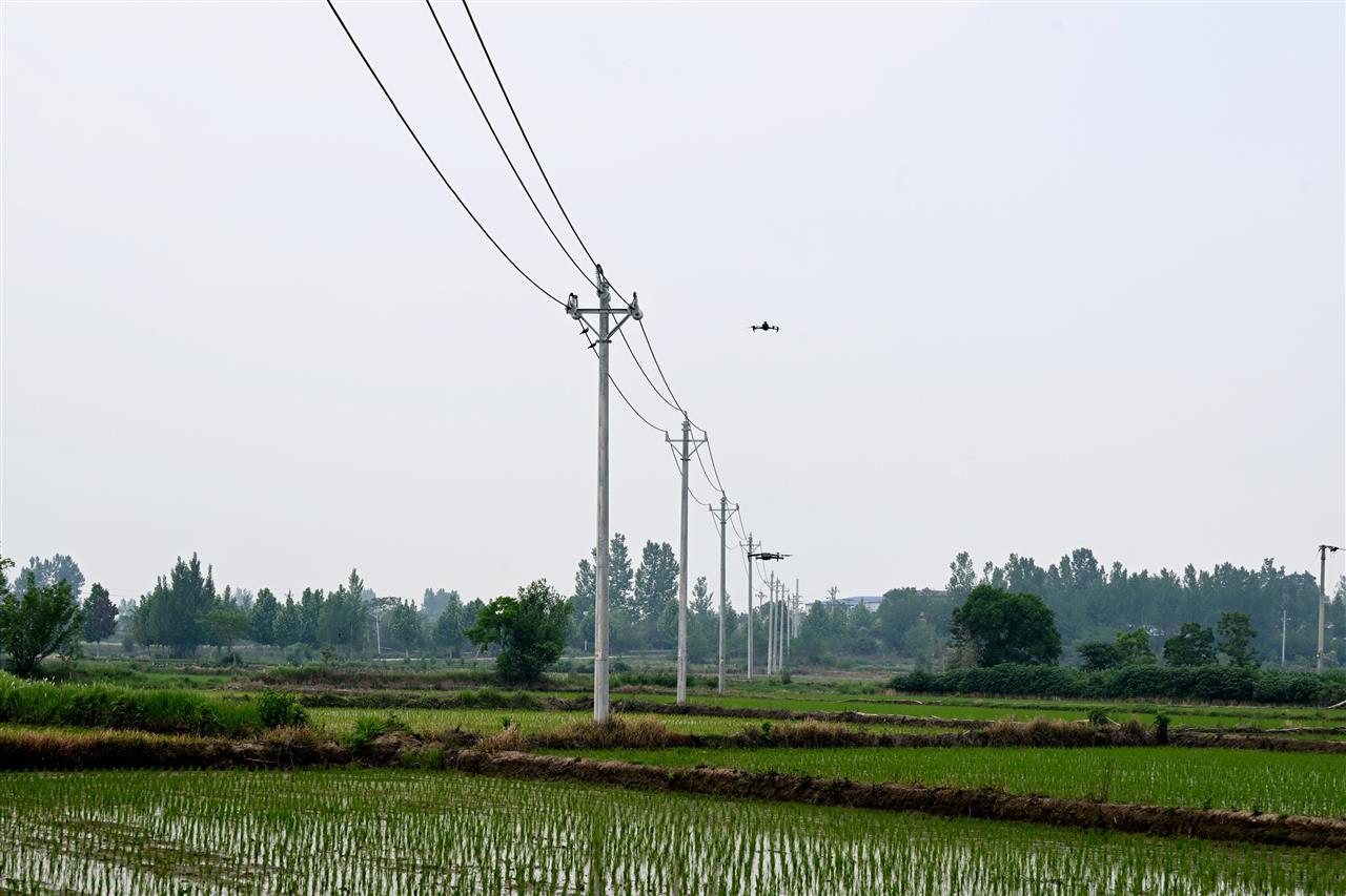 在湖北省安陸市木梓鎮(zhèn)10千伏江河線驗(yàn)收現(xiàn)場,國網(wǎng)湖北電力利用無人機(jī)AI技術(shù)自主驗(yàn)收配電架空線路(余健兵、何瑤 攝)