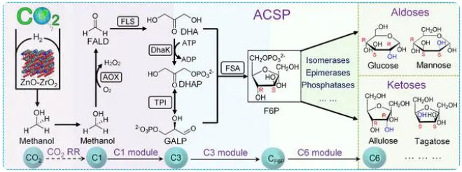 己糖是在自然界廣泛分布、與機(jī)體營養(yǎng)代謝最為密切的糖的統(tǒng)稱。迄今為止,人類對(duì)糖的獲取主要依賴于植物類生物質(zhì)資源。然而,這種傳統(tǒng)的“二氧化碳-生物質(zhì)資源-糖”的加工過程,受到植物光合作用能量轉(zhuǎn)換效率限制;更重要的是,由于土地退化和短缺、生態(tài)系統(tǒng)退化、全球變暖導(dǎo)致的極端天氣和自然災(zāi)害,使依賴于糖類生物質(zhì)資源的生產(chǎn)方式面臨著原料供應(yīng)的安全和風(fēng)險(xiǎn)。