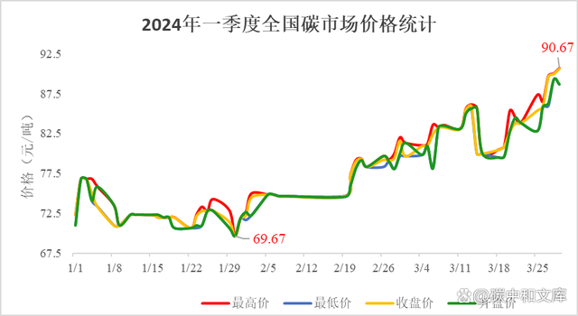 根據(jù)下圖可知,2024年一季度全國(guó)碳市場(chǎng)價(jià)格呈現(xiàn)一個(gè)波動(dòng)上漲的趨勢(shì),其中最高價(jià)出現(xiàn)在3月29日,最低價(jià)出現(xiàn)在1月30日,僅69.67元/噸。而平均最高價(jià)為78.22元/噸,最低平均價(jià)為77.13元/噸,平均開(kāi)盤(pán)價(jià)為77.73元/噸,平均收盤(pán)價(jià)為77.42元/噸。