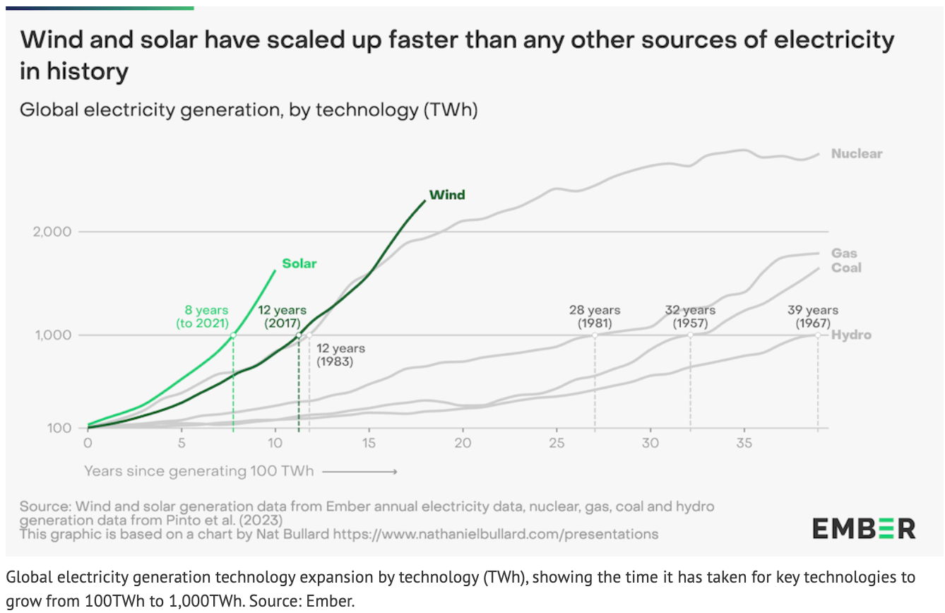 根據(jù)智庫Ember的最新報告分析,在全球范圍內(nèi)風能和太陽能的增長速度比歷史上任何其他電力來源都快。太陽能和風能從每年100太瓦時增長到1000太瓦時,分別只花了8年和12年的時間。同樣是100太瓦時到1000太瓦時,天然氣電廠花了28年、煤電化了32年、水電花了39年。