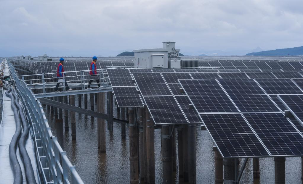 6月29日,國網(wǎng)浙江象山縣供電公司工作人員正在巡檢象山長大涂灘涂光伏設備。新華社記者 徐昱 攝