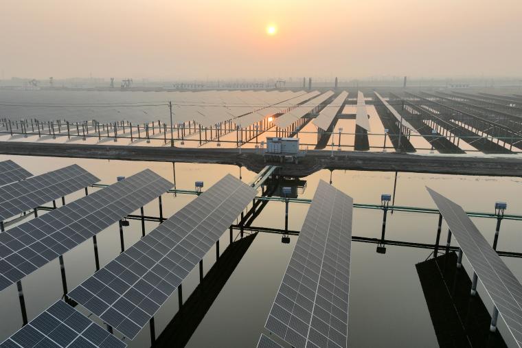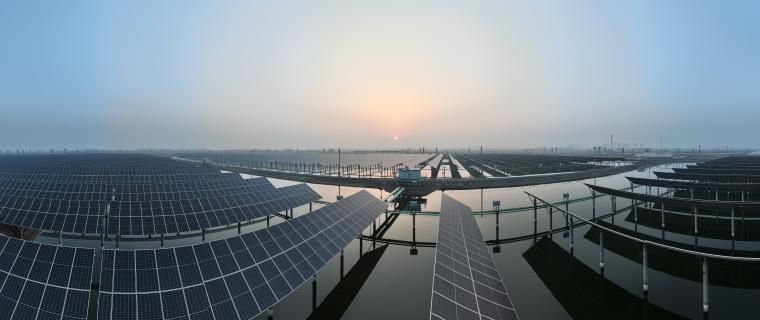 晨曦中的水面光伏發(fā)電項目。(王翔攝)
