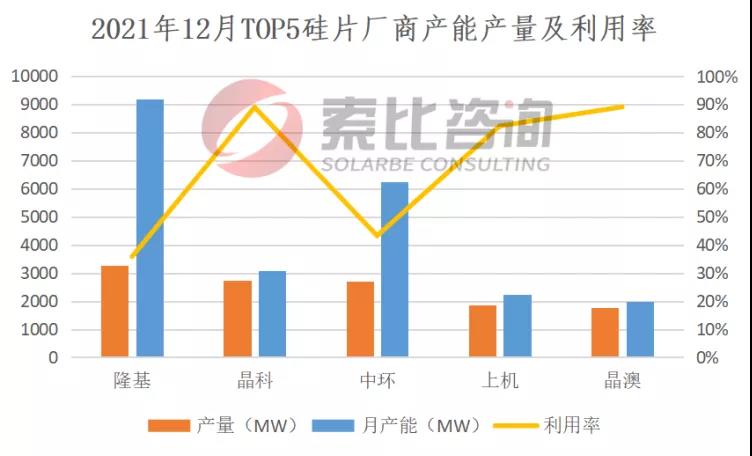 根據(jù)索比咨詢統(tǒng)計,2021年12月,前五大硅料企業(yè)總產(chǎn)量4.14萬噸,綜合產(chǎn)能利用率112.6%。硅片方面,兩家頭部企業(yè)開工率回至50%以上,一體化企業(yè)開工率相對較高。去年12月,國內(nèi)硅片產(chǎn)量17.85GW,環(huán)比下降8.6%。按照產(chǎn)量排名,隆基、晶科、中環(huán)、上機(jī)、晶澳位列前五,總產(chǎn)量12.35GW,占比69.19%,綜合利用率67.81%。雖然有觀點(diǎn)認(rèn)為,中環(huán)的實(shí)際產(chǎn)能利用率要高于上述數(shù)據(jù),但總體看,產(chǎn)業(yè)鏈上游價格居高不下,已經(jīng)影響到終端需求,并反作用于上游。