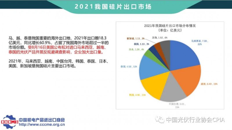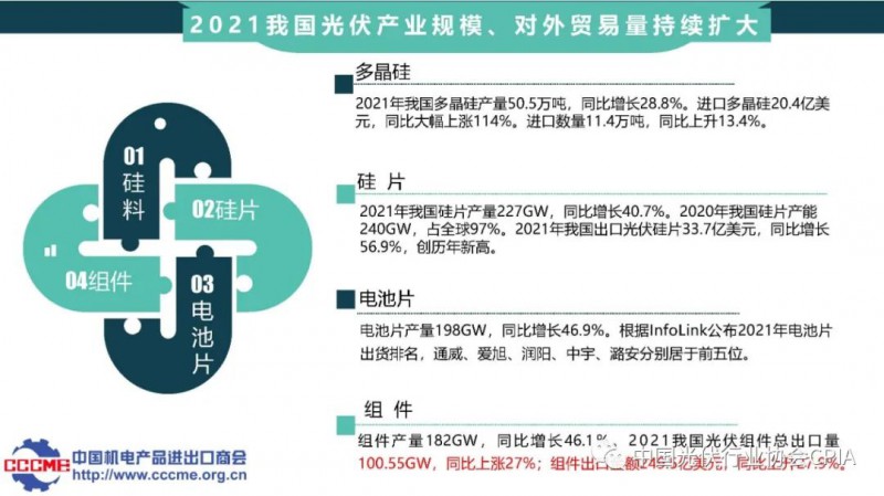 中國機(jī)電產(chǎn)品進(jìn)出口商會(huì)光伏分會(huì)秘書長張森介紹光伏產(chǎn)品國際貿(mào)易情況。2021年我國光伏產(chǎn)業(yè)規(guī)模、對(duì)外貿(mào)易量持續(xù)擴(kuò)大,行業(yè)發(fā)展主要痛點(diǎn)是光伏貿(mào)易摩擦再次升級(jí)、海運(yùn)費(fèi)和匯率大幅上漲等。