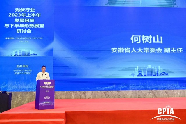 2023年7月20日,由中國光伏行業(yè)協(xié)會、宣城市人民政府主辦的“光伏行業(yè)2023年上半年發(fā)展回顧與下半年形勢展望研討會”在安徽省宣城市成功舉辦。安徽省人大常委會副主任何樹山出席會議并致辭。