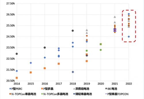 在內(nèi)外部環(huán)境的共同推動(dòng)下,我國光伏企業(yè)加大工藝技術(shù)研發(fā)力度,生產(chǎn)工藝水平不斷進(jìn)步,不斷刷新紀(jì)錄。據(jù)中國光伏行業(yè)協(xié)會(huì)統(tǒng)計(jì),2014—2022年,我國企業(yè)、研究機(jī)構(gòu)晶硅電池實(shí)驗(yàn)室效率共打破世界紀(jì)錄56次;2022年,刷新效率紀(jì)錄14次,其中10次為n型電池技術(shù)。未來隨著生產(chǎn)成本的降低及良率的提升,n型電池將會(huì)成為電池技術(shù)的主要發(fā)展方向之一。