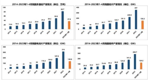 近年來,我國光伏發(fā)電裝機(jī)規(guī)模持續(xù)擴(kuò)大,目前已成為全球最大的光伏應(yīng)用市場。2014~2022年,年均復(fù)合增長率約為41.3%。2022年,我國新增光伏發(fā)電并網(wǎng)裝機(jī)容量87.41GW,連續(xù)10年穩(wěn)居世界首位。截至2022年底,我國光伏發(fā)電并網(wǎng)裝機(jī)容量達(dá)到3.9億kW,同比增長28.1%,連續(xù)8年穩(wěn)居全球首位。2023年1~4月,我國新增光伏發(fā)電并網(wǎng)裝機(jī)容量48.31GW,同比增長186%,已超過2022年前八個(gè)月總裝機(jī)容量。截至2023年4月底,我國光伏累計(jì)裝機(jī)4.4億kW,僅次于火力發(fā)電,在全國電力總裝機(jī)中的占比為16.6%。