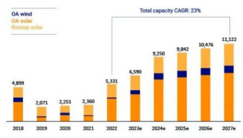 印度的基本關(guān)稅(BCD)進口稅以及型號和制造商批準(zhǔn)名單(ALMM)計劃在繼續(xù)限制供應(yīng),因此,印度最近一直在經(jīng)歷組件供應(yīng)短缺問題。鑒于此,報告認為,在今年剩下的時間里,增速將會放緩,但2024年及之后的數(shù)字將開始更快的增長。預(yù)計2023年,企業(yè)可再生能源容量將增加6.5GW,而2024年將超過9GW。