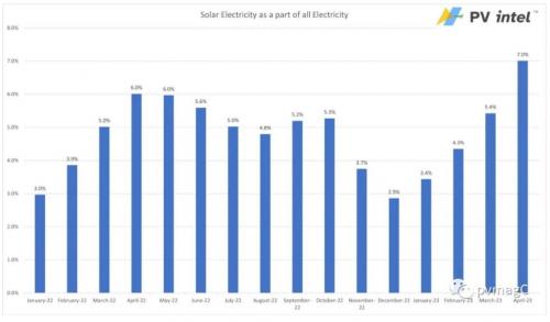 美國能源部能源信息署(EIA)發(fā)布了最新的月度電力報告,提供了截至4月底的數(shù)據(jù)。最新數(shù)據(jù)顯示,與去年4月相比,太陽能發(fā)電量增長了16.6%,占當(dāng)月美國總發(fā)電量的7%多一點,高于2022年的6%。