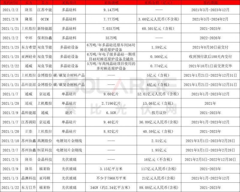 硅片方面,通威與京運(yùn)通、上機(jī)數(shù)控累計(jì)簽訂單晶硅片訂單超12億片;晶科能源向通威采購(gòu)硅片6.5GW;江蘇潤(rùn)陽(yáng)向京運(yùn)通采購(gòu)硅片9.46億片;正泰向上機(jī)數(shù)控采購(gòu)單晶硅片8.82億片,以上合同采購(gòu)期限均為2021-2023年。同時(shí),蘇州協(xié)鑫與高測(cè)股份、恒星科技簽訂總價(jià)4.46億元的電鍍切片金剛線采購(gòu)項(xiàng)目。