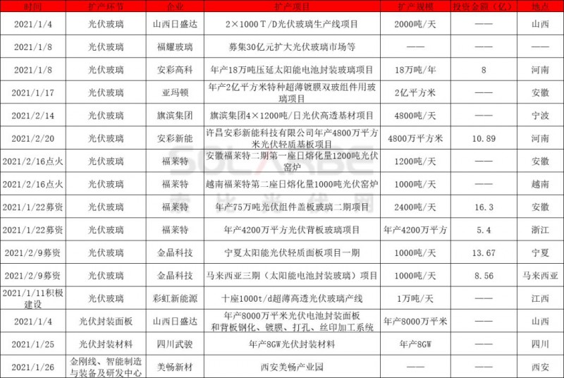 自去年12月16日工信部宣布放開(kāi)光伏玻璃擴(kuò)產(chǎn)限制后,2021年開(kāi)年至今,安彩高科、安彩新能、亞瑪頓紛紛加速光伏玻璃擴(kuò)產(chǎn)。1月8日,安彩高科宣布與博愛(ài)凌創(chuàng)合資成立焦作安彩新材料有限公司,開(kāi)展年產(chǎn)18萬(wàn)噸壓延太陽(yáng)能電池封裝玻璃項(xiàng)目建設(shè)。1月17日,亞瑪頓旗下鳳陽(yáng)硅谷智能有限公司二期項(xiàng)目“年產(chǎn)2億平方米特種超薄鍍膜雙玻組件用玻璃項(xiàng)目”在滁州舉行開(kāi)工儀式。2月20日,安彩新能年產(chǎn)4800萬(wàn)平方米光伏輕質(zhì)基板項(xiàng)目開(kāi)工,項(xiàng)目投資10.89億,涵蓋1.8~4.0mm厚度光伏玻璃產(chǎn)品,支持超大規(guī)格電池組件。