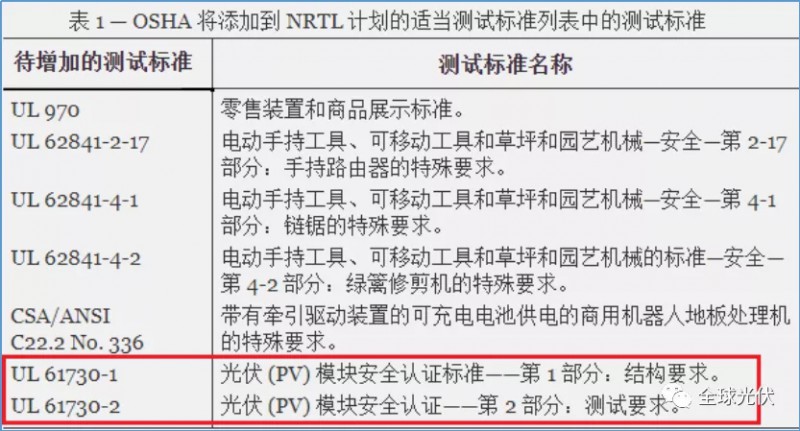 OSHA 于 2021 年 8 月 16 日發(fā)布通知,宣布修改 NRTL 計劃的適當(dāng)測試標準清單和認可范圍的提案 ( 86 FR 45755 )。其中和光伏產(chǎn)品相關(guān)的是光伏組件的安全認證標準。