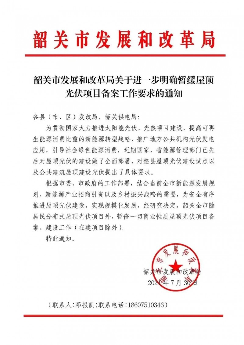 韶關(guān)市發(fā)展和改革局關(guān)于進一步明確暫緩屋頂光伏項目備案工作要求的通知