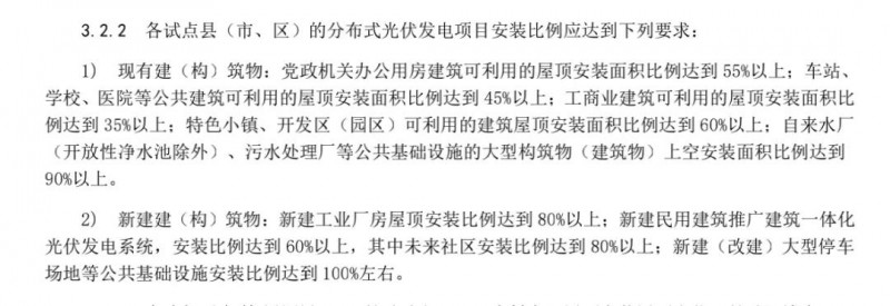 各試點(diǎn)縣(市、區(qū))的分布式光伏發(fā)電項(xiàng)目安裝比例也提出了現(xiàn)有建筑物和新增建筑物的安裝比例方面也提出一定要求。