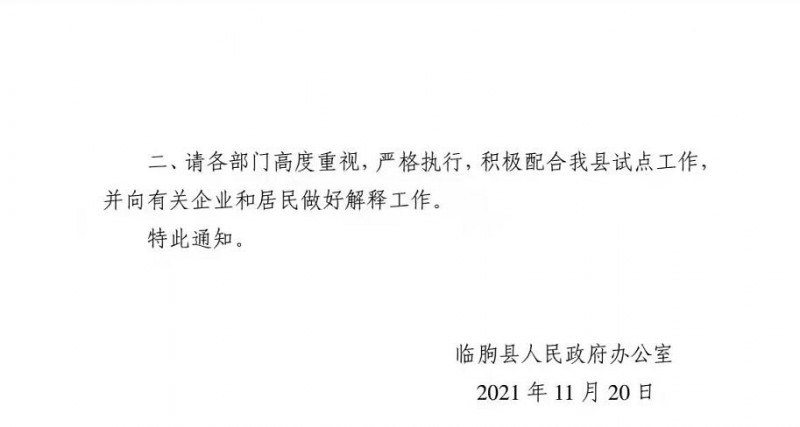 二、請(qǐng)各部門高度重視,嚴(yán)格執(zhí)行,積極配合我縣試點(diǎn)工作,并向有關(guān)企業(yè)和居民做好解釋工作。