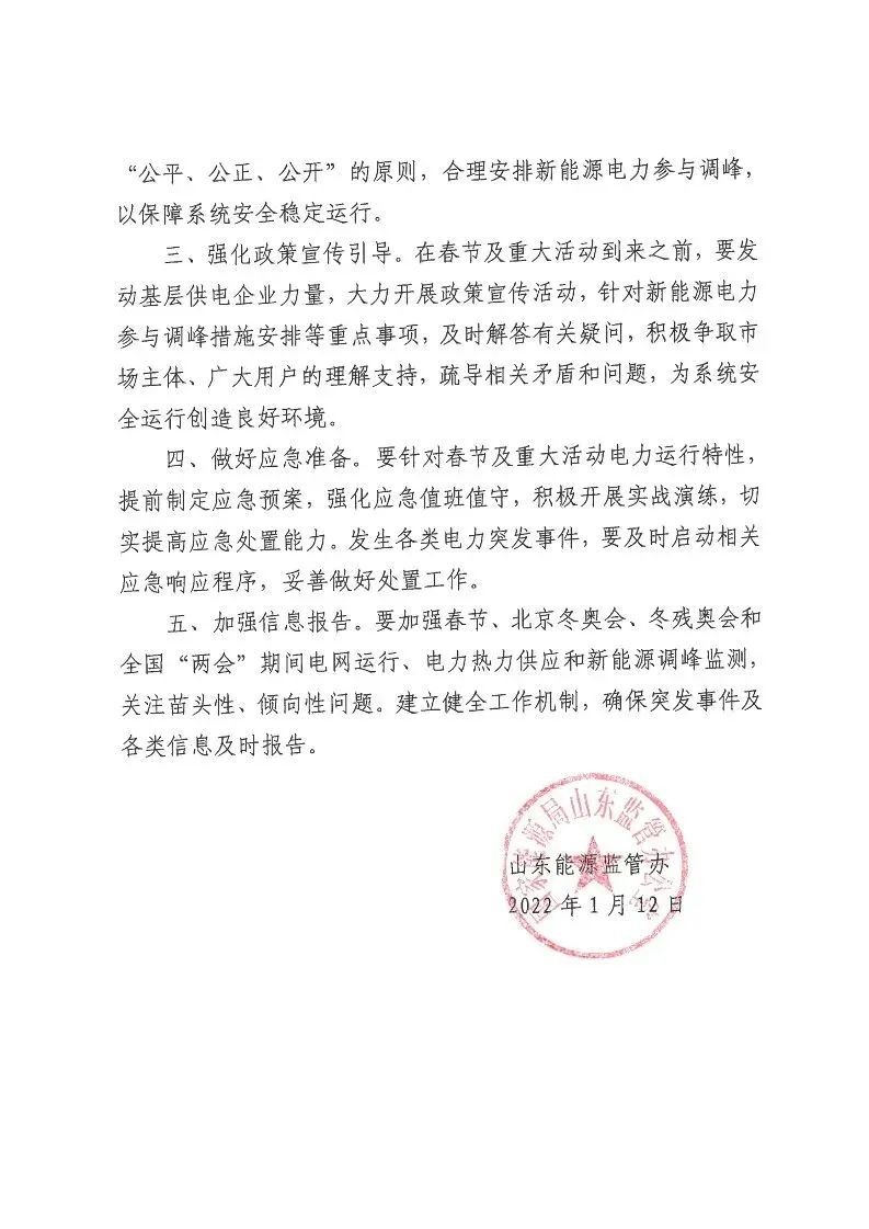 1月12日,山東省能監(jiān)辦《關(guān)于做好2022年春節(jié)及重大活動(dòng)期間電網(wǎng)安全穩(wěn)定運(yùn)行工作的通知》,就春節(jié)期間保障電力系統(tǒng)安全穩(wěn)定運(yùn)行和新能源發(fā)電調(diào)節(jié)能力要求方面提出意見。
