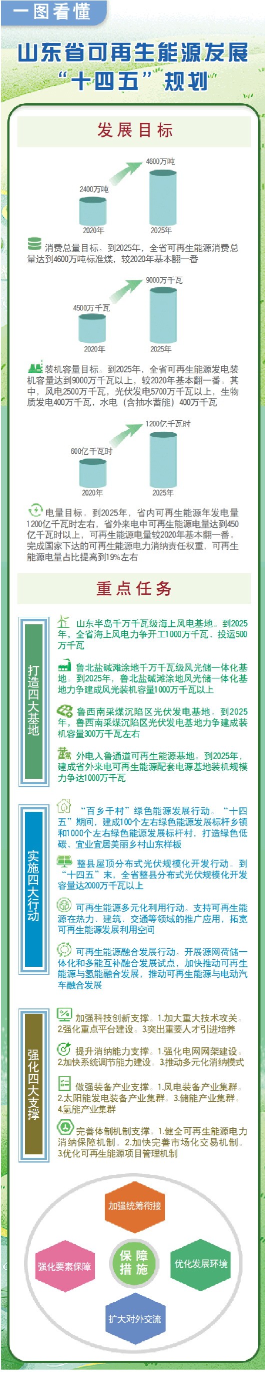 近日,山東印發(fā)《山東省可再生能源發(fā)展“十四五”規(guī)劃》(以下簡(jiǎn)稱(chēng)《規(guī)劃》),《規(guī)劃》涵蓋了風(fēng)能、太陽(yáng)能、生物質(zhì)能、水能、地?zé)崮艿戎攸c(diǎn)領(lǐng)域,明確了2021年至2025年我省可再生能源發(fā)展的基礎(chǔ)條件、面臨形勢(shì)、指導(dǎo)思想、基本原則、發(fā)展目標(biāo)、重點(diǎn)任務(wù)以及保障措施等,是“十四五”時(shí)期全省可再生能源發(fā)展的依據(jù)。